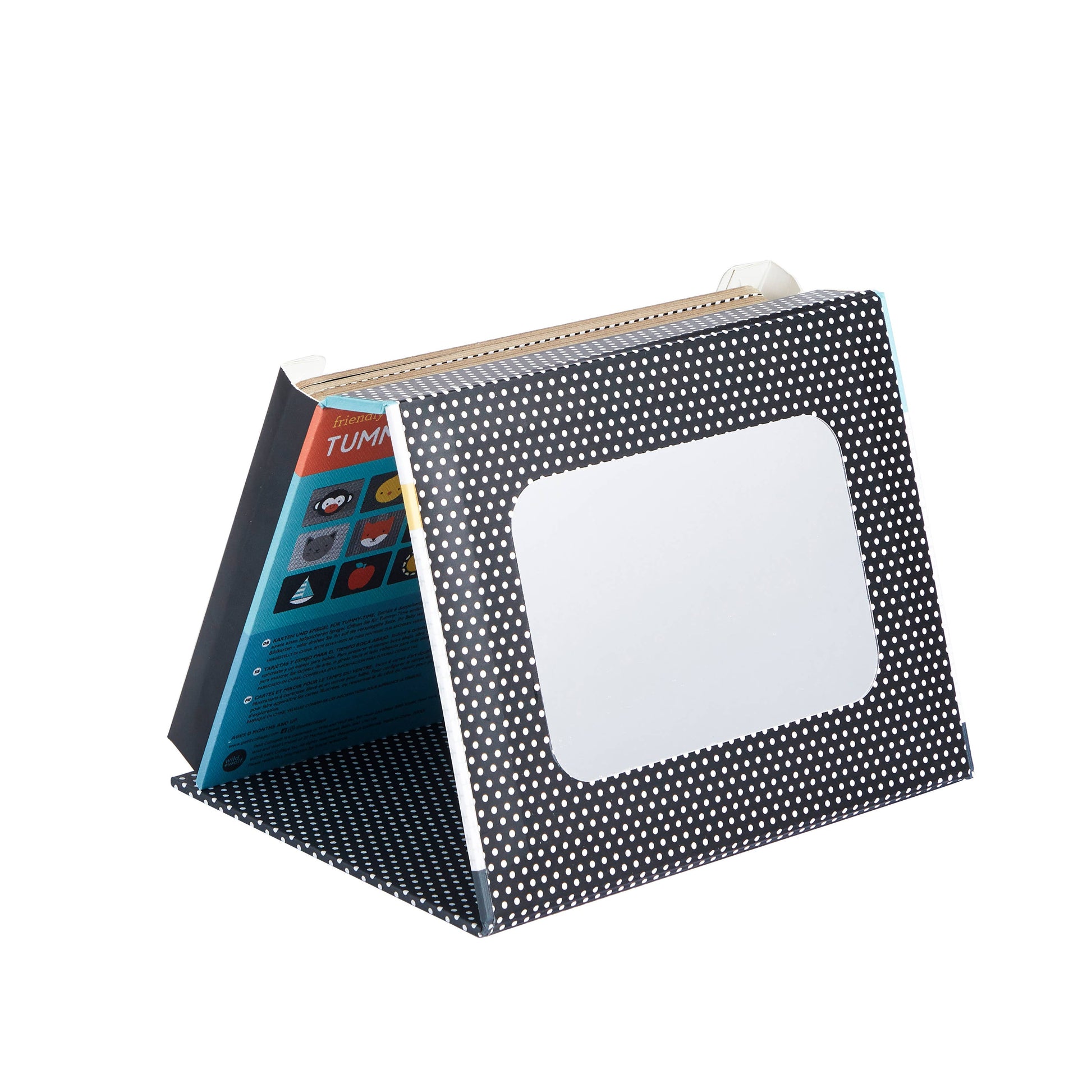 Make tummy time fun with Tummy Time Peekaboo! Our art cards feature smiling animal faces and playful icons. High-contrast colors and bold shapes aid the baby’s visual development. To set up for tummy time, flip open the simple stand-up easel box to display the art cards, or turn it around to the mirrored side for more fun and exploration. The collapsible stand includes 6 double-sided high-contrast art cards and a baby-safe mirror.